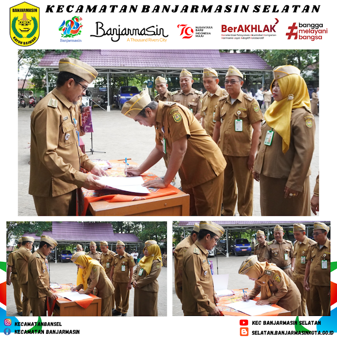 Penandatanganan Perjanjian Kinerja (PK) antara Camat Banjarmasin Selatan Drs. Firdaus, M.Si dengan Lurah se Kecamatan Banjarmasin Selatan serta Penjabat Stuktural Se Kecamatan Banjarmasin Selatan dan Suray Perjanjian Kinerja (SPK) Pengelola Data pada Kecamatan dan Kelurahan sebanyak 13 orang bertempat di Halaman Kantor Kecamatan Banjarmasin Selatan.